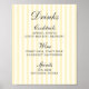 Invite a sus huéspedes a una sofisticada celebración con nuestro elegante poster de menú del bar Bridal Soirée, donde la elegancia atemporal se combina con el encanto moderno. Este poster de excelente factura presenta un tranquilo fondo de rayas amarillas suaves, que ofrece una cálida y acogedora tela que exuda elegancia y sofisticación. Las tiras suaves añaden una textura sutil, realzando la estética general manteniendo al mismo tiempo un atractivo clásico. Con texto de personalizable completo, este signo puede ser personalizado para satisfacer sus necesidades.