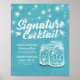 Plantillas de cartel de menú de bebida de cóctel de firma para decoración de boda - Letra elegante y pareja vintage en frascos de Mason y luces de cuerda sobre fondo floral azul claro.