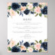 El menú de la cena incluye elegantes flores color agua rosa y azul marino con una sencilla y atemporal combinación de fuentes. Es el menú perfecto para la pareja romántica clásica, pero se puede modificar para adaptarlo a cualquier evento que se tenga en mente.