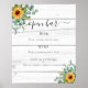 Madera rústica blanca como fondo. Decorado con girasoles de color acuático y vegetación eucaliptus. Con el texto: Abrir barra. Personalice y agregue el menú de la barra.