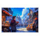 Un ilustracion digital de un estilo de arte personalizado de un mercado vacacional muy detallado con puestos de venta de artesanías, adornos y decoraciones festivas.
