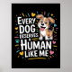 Este encantador gráfico presenta un perro de dibujos animados alegre, marrón claro y blanco con ojos expresivos y una expresión alegre y de boca abierta. El texto, en letra divertida y multicolor (naranja, amarillo, azul, rojo) declara, "CADA PERRO MERECE UN HUMANO COMO YO", con un icono óseo y acentos de estallido. Este diseño celebra la propiedad responsable y amorosa del perro con un sólido fondo negro. Descarga digital sólo para uso personal.