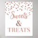 Cartel de la mesa de postres de dulces y dulces para la ducha de bebé, la ducha de novia, la fiesta de cumpleaños o el boda en un patrón de confeti de oro rosa.
