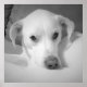 Póster Mezcla blanca de labradores sentada en un sofá gri