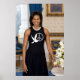 La primera dama de paz. Michelle Obama con vestido negro sin mangas adornado con paloma blanca y símbolo de paz.