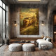 This mid-century retro vintage artwork depicts a classic train traveling through Venice in the style of timeless European travel posters. Warm golden hues, painterly textures, and a nostalgic mood celebrate the romance of historic rail journeys and Venetian landscapes. Ideal for mid-century modern interiors, offices, or living spaces, adding elegance and vintage travel charm.