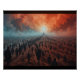 Una representación fotorrealista y abstracta de la "migración climática" con innumerables figuras pequeñas, oscuras e indistintas (movimiento evocador y anonimato, como hojas eólicas o tendriles de humo) que fluyen unidireccionalmente por un vasto paisaje. Estas cifras se alejan de una "zona inhabitable" distante, ferozmente roja, caldeada y asolada por las tormentas hacia una "zona de refugio potencial" tenue, más fría y pálida, que parece cada vez más abarrotada y sutilmente fortificada con fronteras abstractas. El viaje a través del terreno estéril y surrealista simboliza una migración ardua en medio de una catástrofe climática, combinando un paisaje abstracto con una sensación de desesperación y esperanza.