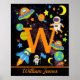 Un fabuloso poster de espacio exterior personalizado y colorido para un dormitorio para niños. Presenta astronautas, alienígenas de los buques de cohetes y planetas con un fondo fotográfico de la orilla. Perfecto para la decoración de las habitaciones de los niños o para la impresión de las guarderías. Personalice modificando el nombre y el inicial.