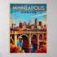 Este animado ilustracion de estilo retro ofrece el encanto de Minneapolis, el emblemático puente Stone Arch y ricos tonos otoñales. Este nostálgico trabajo artístico destaca la belleza de la ciudad más grande de Minnesota, perfecta para decoración en casa o de oficina. Un gran regalo para viajeros, lugareños o amantes del arte clásico del paisaje urbano.