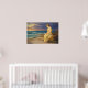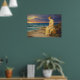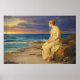 The ocean stretches out behind her in bands of deep blue and green, with small white crests rolling toward the shore. The sky dominates the scene, filled with layered clouds that shift from cool violet and slate tones to a glowing strip of gold and rose near the horizon, as if the sun is setting just out of view. Light catches Miranda’s hair and the fabric of her dress, giving her a gentle radiance against the darker sky.