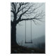Imagen fotorrealista y de alta definición de un balancín solitario de madera colgado de un gran árbol desnudo sobre una colina polvorienta y desolada. El columpio está vacío e inmóvil, evocando una atmósfera tranquila y melancólica llena de un sentido de ausencia o anhelo. La amplia y suavemente borrosa niebla en el fondo proporciona amplio espacio para copiar. Ideal para temas de soledad, nostalgia o narración reflexiva.
