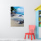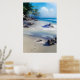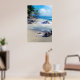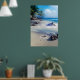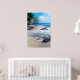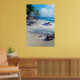 Hermoso ilustracion acuático de una playa tropical con palmeras, rocas, olas y cielos nublados azules. Una IA creó una fantasía digital de arte impresa.
