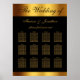 Este elegante gráfico de asientos en negro y oro presenta caligrafía en oro falso con los nombres de invitados de la novia y el novio para personalizar con un falso borde dorado sobre fondo negro. Para un máximo de 12 mesas. Diseñado por Susan Coffey.