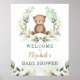 Este elegante poster de bienvenida cuenta con un lindo oso de peluche que sostiene un globo en forma de corazón enmarcado por una hermosa cortina de color acuático