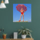 ¡Una imagen impactante! Modelo retro bikini con parasol de rayas rojas, parado en roca a la luz del sol clara. Aquí viene el sol es texto editable. Agrega tu propio mensaje o elimina. Poster físico y descarga digital disponible.