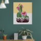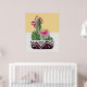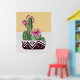 Modern watercolor cactus art design features illustrated shallow bowl filled with variations of flowering cacti on colorblock background