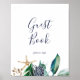 Este letrero moderno náutico de libro de invitados de verde es perfecto para una boda en un crucero o en la playa. El diseño botánico cuenta con hermosas hojas verdes con flores navy y acentos de estrellas de mar doradas, lo que le da un ambiente playero.
