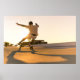 El entrenamiento de surf en patinaje se mueve cerca de la playa al atardecer.