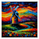 A.I. creó la impresión de un molino de viento colorido en medio de campos rodados mientras un camino sinuoso conduce a través del exuberante paisaje bajo el cielo surrealista y el sol abrasador.
