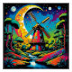 A.I. creó una huella de bajo un cielo psicodélico surrealista lleno de una variedad de cuerpos celestes, un vibrante molino de viento está rodeado por un paisaje de vegetación exuberante y jungla reflejada en un cuerpo adyacente de agua.