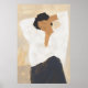Una pintura minimalista y abstracta con una figura relajada con los ojos cerrados y los brazos descansando detrás de la cabeza. La obra de arte utiliza tonos suaves y cálidos y brochas simplificadas, lo que da una sensación de calma e introspección. La camisa blanca de la persona contrasta suavemente con los tonos más oscuros de sus pantalones, mejorando el ánimo sereno de la pieza.