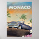 Cartel de viaje en coche de Mónaco y una hermosa puesta de sol.