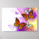 Orange, detailed monarch butterflies on light, purple, picturesque, painted background.