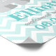 El elegante y dulce personalizado "Welcomed with love", poster de arte infantil, cuenta con un adorable y pequeño becerro de elefante recién nacido gris con brillantes salpicaduras en forma de azul acuático, un moderno patrón de fondo de rayas de chevron azul y blanco acuático, texto personalizado para el nombre y fecha de nacimiento del bebé.