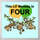 Tres pequeños monos balanceándose de un árbol en los monos Swinging Camisetas de cumpleaños, trajes para el cuerpo, tazas, tarjetas, bolsos de té, botones y otros artículos para un tema de monos ¡4 años a tu hijo le encantará!