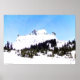 Una pintura de una cima de montaña cubierta de nieve que es el cuerpo de tres cabras jóvenes de montaña. Esta escena montañosa de invierno cuenta con pequeños grupos de pinos y un hermoso cielo azul. Pintura ©2017 Kimberly J Tilley.