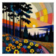 Una agencia de inteligencia creó la interpretación de una vibrante puesta de sol con vigas de naranja y luz amarilla que divide el cielo sobre un bosque de pinos de silueta. En primer plano, un campo de flores de colores vivos contrasta con los árboles oscuros del paisaje lejano.