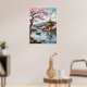 Este cuadro representa un paisaje japonés sereno con una pagoda tradicional y árboles de flores de cerezo a lo largo de la orilla de un lago. Un gran árbol de flores de cerezo con flores rosadas vibrantes domina el primer plano, mientras que el icónico Monte Fuji, nevado, se encuentra al fondo. Un pequeño barco se encuentra sobre el agua tranquila, que refleja el paisaje de los alrededores y un cielo azul con nubes blancas. La obra de arte tiene una textura rica y pintoresca con pinceles visibles, lo que le da una estética apacible y clásica.