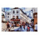 Peinture de style impressionniste de la rue Norvins à Montmartre, Paris. On peut y voir une scène urbaine animée avec des bâtiments blancs caractéristiques du quartier, dont un café ou restaurant avec une marquise rouge rayée. Dans la rue, des passants déambulent, créant une atmosphère vivante et typique de ce quartier historique. Au loin, on aperçoit le dôme du Sacré-Cœur, lieu emblématique de Montmartre. L'ensemble est traité avec des touches picturales douces qui donnent un aspect rêveur et nostalgique à cette scène parisienne.