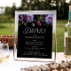 Elegante carta de bebidas bodas floridas con un borde superior de flores moradas y burdeos con hojas verdes y bayas oscuras. El diseño floral morado es complementado por la tipografía caligráfica moderna. Personalice el cartel del menú de bebidas del boda con una selección de bebidas. El gótico cartel del menú de bebidas boda floral es perfecto para mostrar en tu boda de otoño, ducha de novia, ducha de bebé, fiesta de cumpleaños o evento especial. Diseñado para coordinar con nuestra colección Moody Gothic Floral boda.