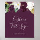 Este símbolo de texto personalizado de tarjetas moradas de ciruela morada y regalos es perfecto para un boda moderno. El elegante diseño floral presenta flores de tulipano moradas de ciruela oscura y blancas con hojas de color verde esmeralda y acentos de hojas de oro. ¡personalizar la redacción para decir lo que quieras! Este letrero se puede usar para tarjetas y regalos, libro de invitados, etiqueta boda, favores, barra de postres — ¡cualquier cosa! Se puede utilizar para un boda, una ducha de novia, una cena de ensayo o cualquier otro evento. La línea de texto al final del cartel puede ser personalizada con la fecha, los nombres de la novia y el novio, o un mensaje corto como "Gracias". Si desea varios signos de coordinación, personalizar y añadir a su carrito uno a la vez.