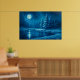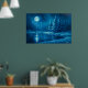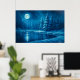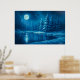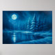 A serene winter forest scene illuminated by a bright full moon. The reflection of the moon shimmers on a calm lake, surrounded by snow-covered trees.