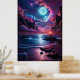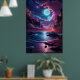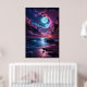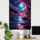 Sumérjase en la fascinante belleza de un poster de ensueño con una impresionante luna colgando con gracia en un cielo pintado de encantadores tonos azul neón y violeta, proyectando un mágico resplandor sobre un océano tranquilo por debajo. El ambiente tranquilo refleja la esencia de la paz y la tranquilidad, invitándole a escapar a un mundo de calma y serenidad.