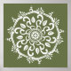 Esta mandala blanca se asienta sobre un musgo oscuro o un fondo verde oliva. Los colores son armoniosos y equilibrados. Parte de la colección Payon Mandala.