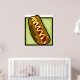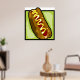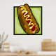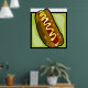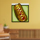 Un sabroso hotdog con un bollo con mostaza encima. Este diseño parece realmente efectivo en este Poster