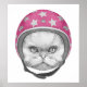 Este diseño presenta un retrato de un gato persa con casco rosa de estilo motorista.