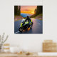 Un motociclista recorre un sinuoso camino de montaña bajo una pintoresca puesta de sol, encarnando aventura y libertad. El entorno natural sereno realza la sensación de exploración y tranquilidad.