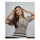 Una mujer elegante con un vestido a rayas posa contra un fondo artístico texturizado. Su expresión es serena y segura de sí misma, complementada por unos elegantes pendientes colgantes.