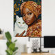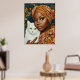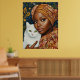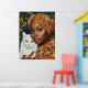 Un retrato cautivador de una joven africana con un velo vibrante, sosteniendo con suavidad un gato blanco, ambientado en un exuberante fondo botánico.
