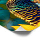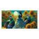 Mujer en un vestido de flores en un campo de girasoles con pavos.