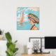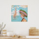 Esta es una versión digitalmente mejorada de una mujer de cosecha estética en la playa. La elegante rubia mira fijamente a lo lejos, formando una imagen serena y armoniosa con el cielo azul, las nubes blancas y los veleros a lo lejos.