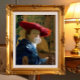 Una mujer con un vibrante gorra rojo soplando un chicle, agregando un toque lúdico a la escena. El fondo está decorado de forma ornamentada y detallada, contrastando con el elemento caprichoso del primer plano.