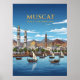 Una vibrante pintura acuática representa el icónico horizonte de Mascate con minaretes y cúpulas, situado sobre un telón de fondo de montañas y un mar tranquilo salpicado de dhows.