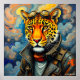 Una fantástica criatura que se parece a un leopardo está adornada con accesorios de vértigo, incluyendo gafas y armaduras intrincadas. El fondo dinámico vívido crea un ambiente caprichoso y aventurero.