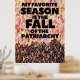Bold feminist art print reading “My Favorite Season Is the Fall of the Patriarchy.” The design combines autumn colors with strong typography, featuring vivid orange, yellow, and pink watercolor brush strokes behind hand-drawn leaves in shades of red and gold. It celebrates empowerment, equality, and social change with a witty seasonal twist — perfect for activists, feminists, and anyone who loves fall and progress. My Favorite Season is the fall of the patriarchy autumn feminist feminism