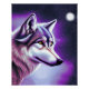 Este es un hermoso poster para un amante de los lobos que presenta un ilustracion de un mítico perfil facial de lobo en blanco y tonos morados y azules.